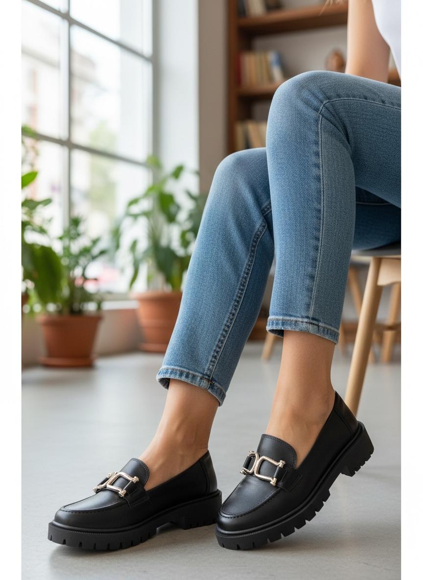 Mocassim Tratorado Preto Fivela Dourada