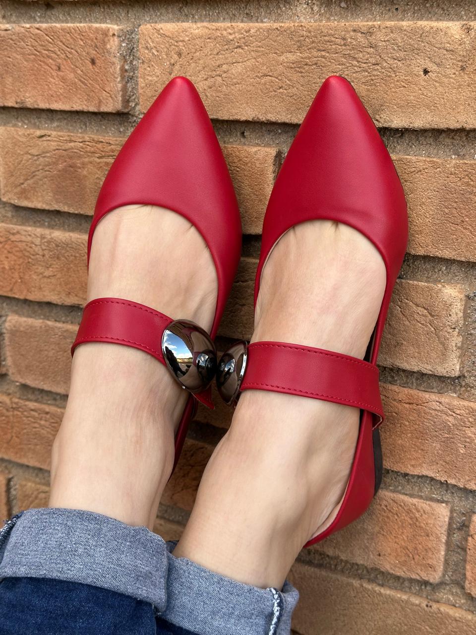 Sapatilha Bico Fino Fivela Oval Arez Vermelha