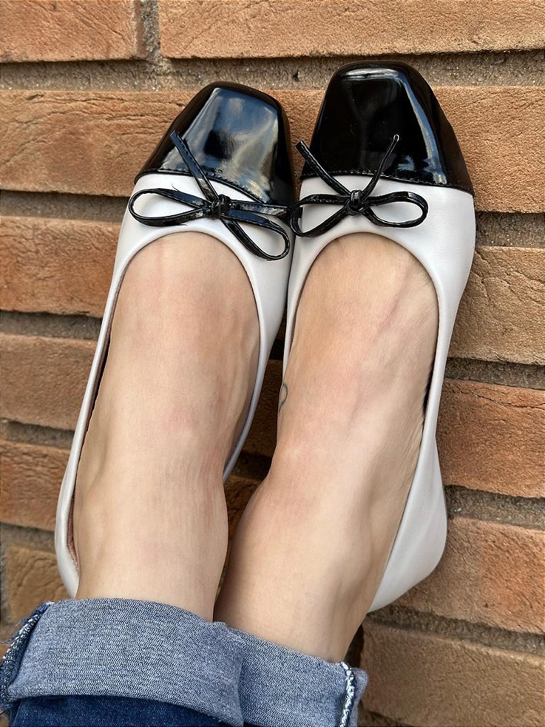 Sapatilha Bico Quadrado Lacinho Branca Ponteira Preta Verniz